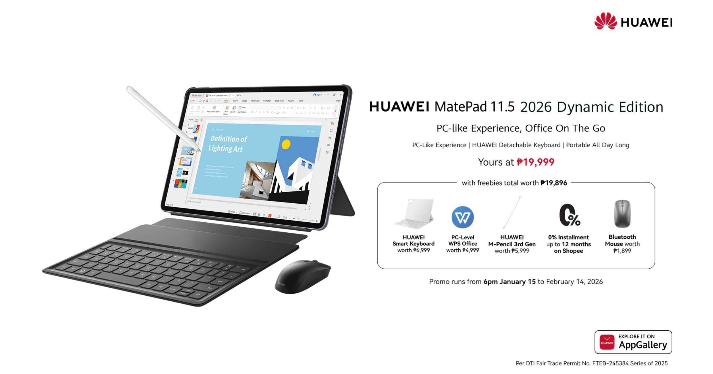 The HUAWEI MatePad 11.5 (2026) Dynamic Edition is available for PHP 19,999, bundled with freebies worth up to PHP 17,997. Get it from January 9–15, 2026 (special selling: Jan 15–18) via HUAWEI Online Store, Shopee, Lazada, and TikTok Shop.