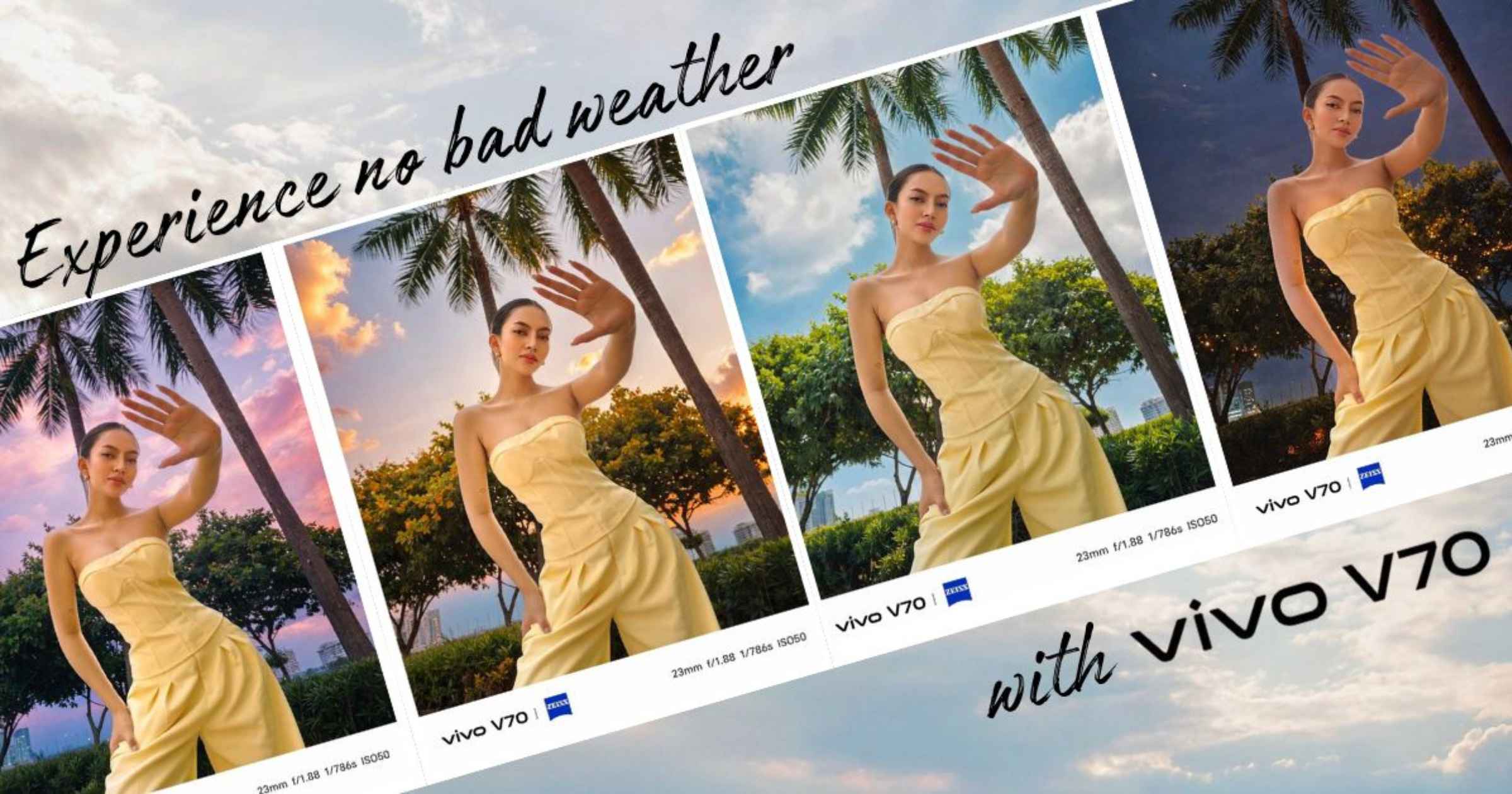 Beauty and lifestyle creator Thalia Balmes recently demonstrated the feature through portrait photography. Using the vivo V70’s ZEISS Telephoto Portrait, she captured a single portrait and transformed it into four different moods using AI Magic Weather.